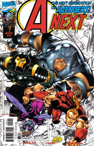 Orange cover. Cover and art by Ron Frenz and Brett Breeding. Written by Tom Defalco and Ron Frenz. The new Avengers help Bill Foster fight the Kree Sentry; His son gains powers and becomes the Earth Sentry; featuring J2, Stinger, Thunderstrike, Mainframe, Scott Lang, Intergalactic Sentry 666, and Earth Sentry (1st app).