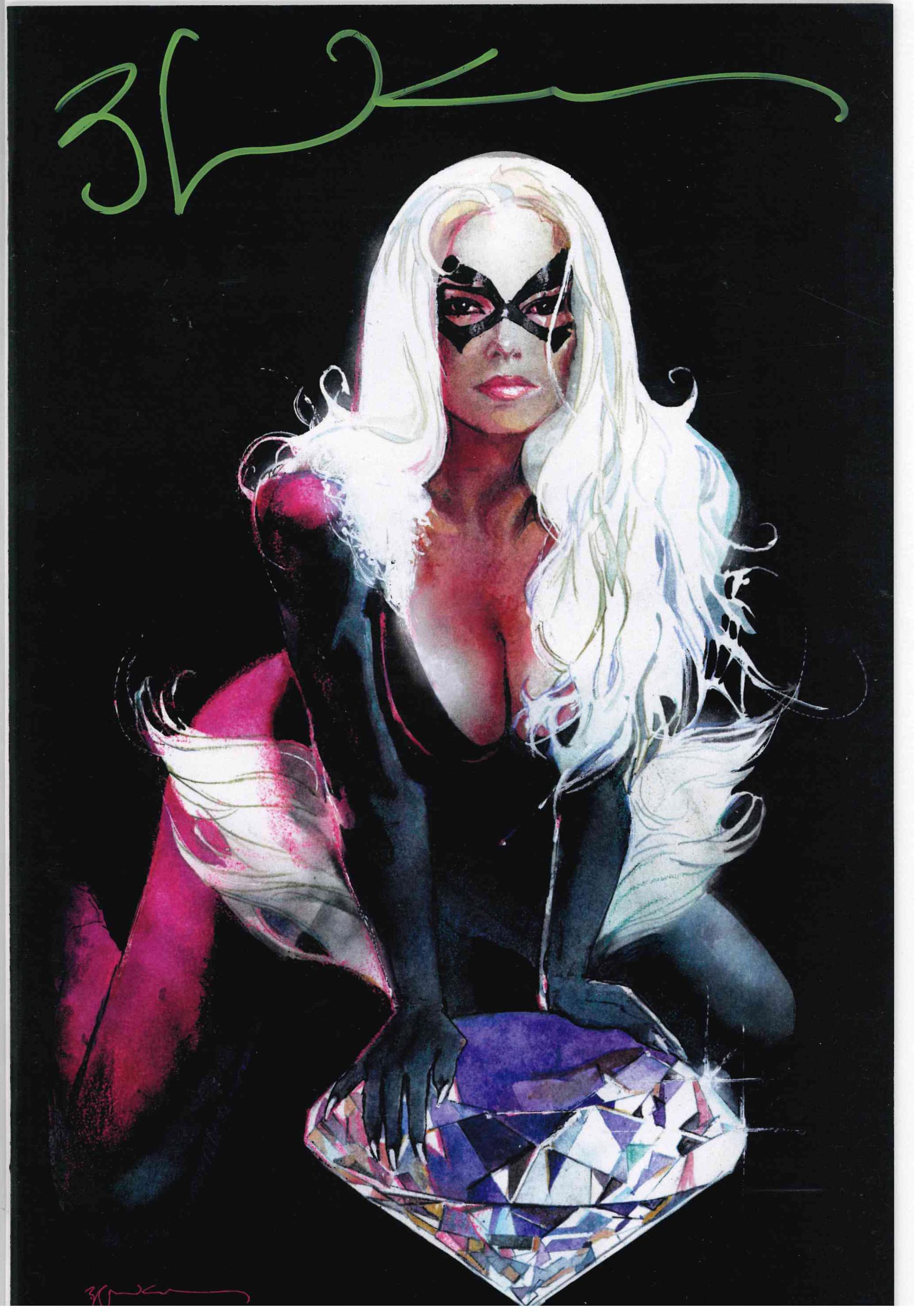 EXCLUSIVE SIGNED by Bill Sienkiewicz - This Black Cat #2 variant cover features a stunning portrait of Black Cat poised atop a massive diamond.