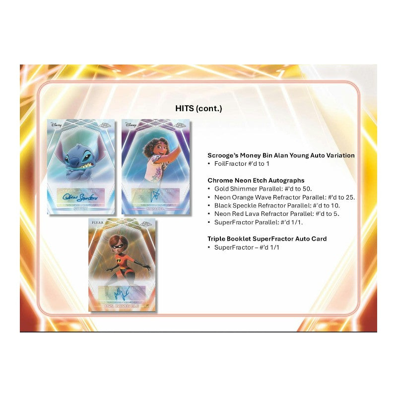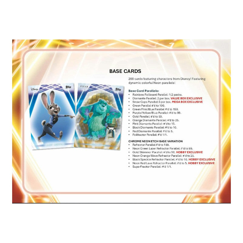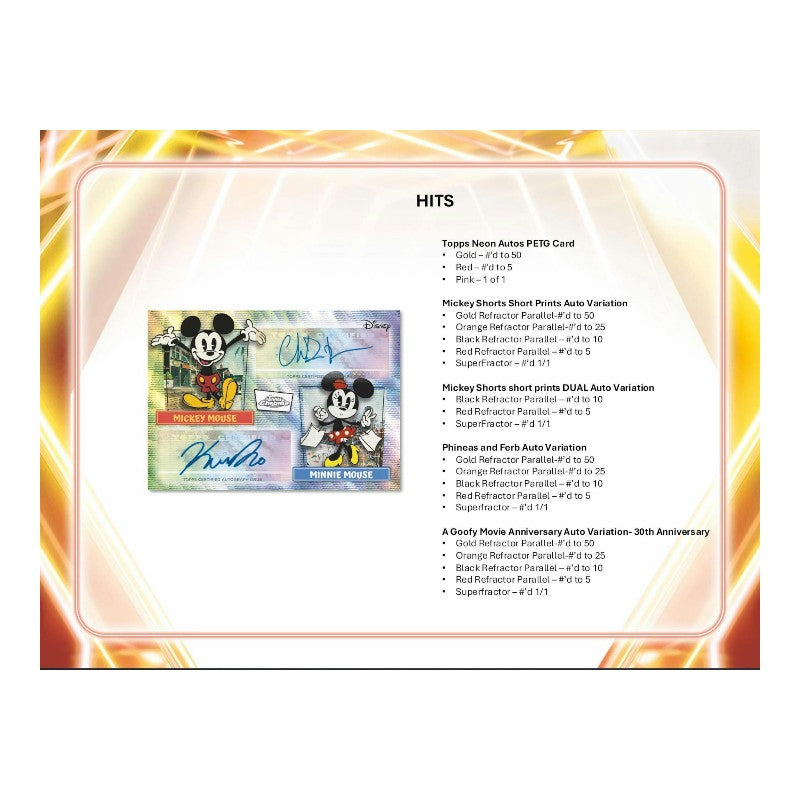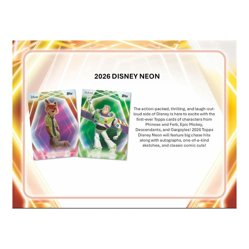 The action-packed, thrilling, and laugh-out-loud side of Disney is here to excite with the first-ever Topps cards of characters from Phineas and Ferb, Epic Mickey, Descendants, and Gargoyles! 2026 Topps Disney Neon will feature big chase hits along with autographs, one-of-a-kind sketches, and classic comic cuts!