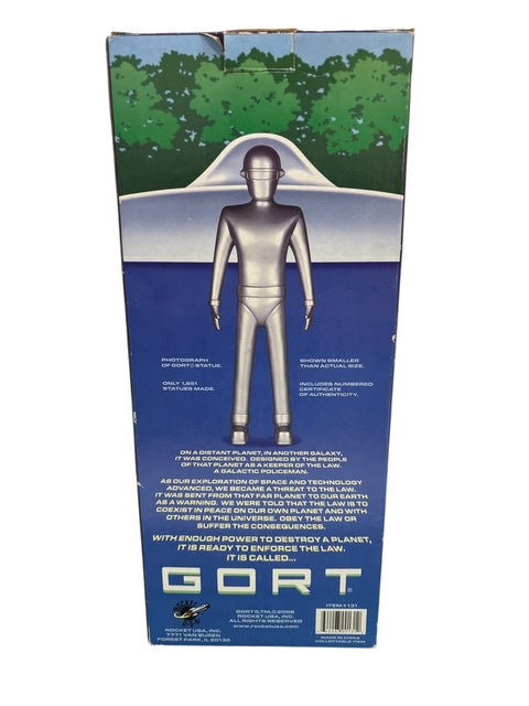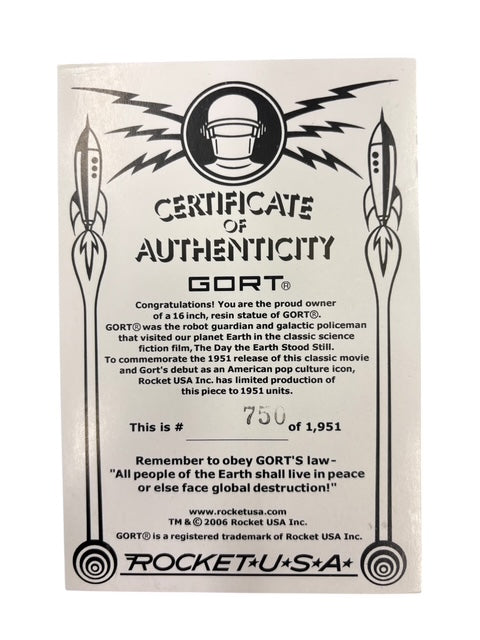 Klaatu, Barada, Nikto! Gort is here, and bigger than ever. From the classic film The Day The Earth Stood Still, this intergalactic policeman first visited our planet in 1951-- and he never really left! Made of resin, this large, heavy 16-inch replica of the famous character stands proud and is colored silver, just like in the movie. Limited edition of 1,951 pieces.