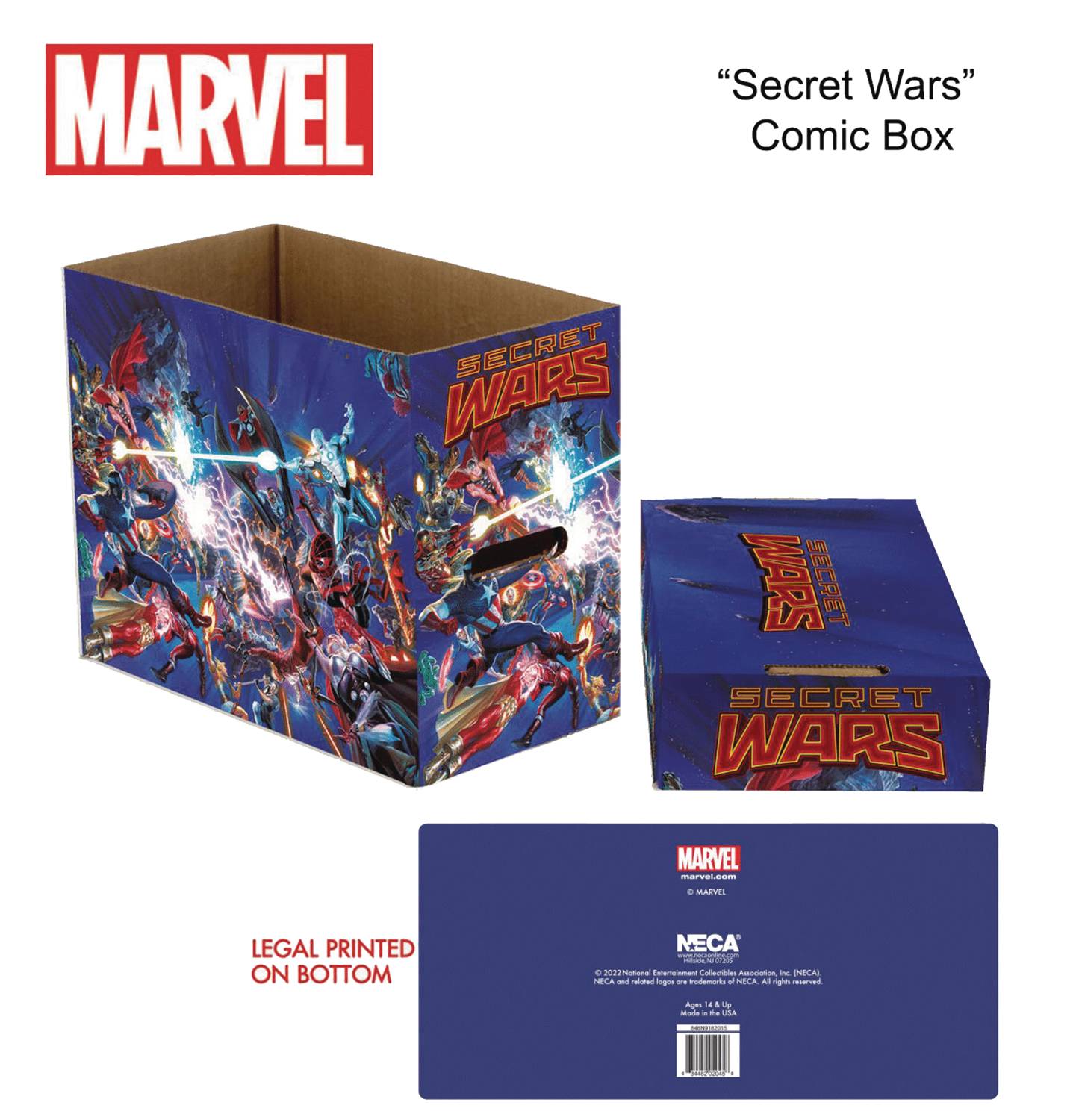 Store your comic books in style with NECA's line of printed short boxes, featuring licensed artwork from Marvel Comics' Secret Wars! They're stackable, simple to assemble and made from sturdy double-walled corrugated material with twohandles and bottom. Each comic book storage box holds approximately 150-175 bagged and boarded comics. Includes lid.